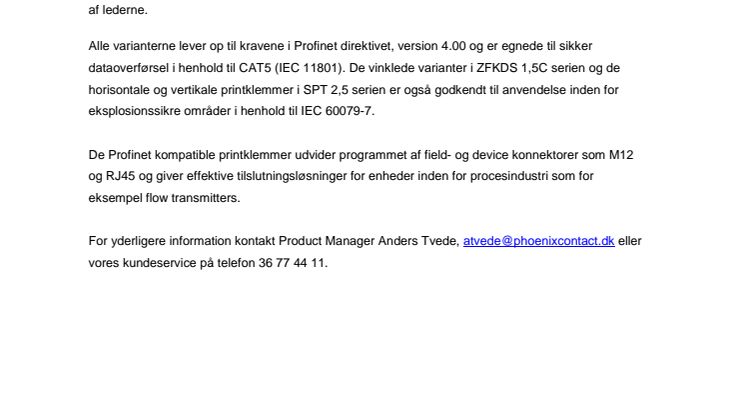 Phoenix Contact tilbyder nu de første printklemmer til Profinet dataoverførsel. Hver af de 4-polede MKDS 1, SPTAF 1, ZFKDS 1,5C og SPT 2,5 printklemmer er designet specielt til tilslutning af twisted pair ledere med tværsnit på 0,14 mm2 til 4 mm2. Ledertilslutningen sker enten med fjedertilslutning (ZFKDS 1,5C), skruetilslutning (MKDS 1) eller Push-in tilslutning (SFTAF 1 og SPT 2,5). Mærkede eller farvekodede tilslutningspunkter muliggør enkel tildeling af lederne.
