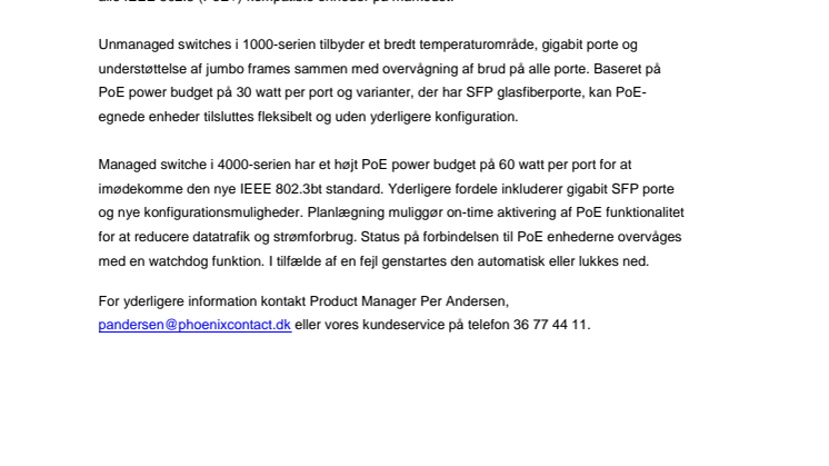 Phoenix Contact udvider sit udvalg af Power over Ethernet (PoE) switche med nye unmanaged og managed switches. Disse switches er udviklet til krævende applikationer som videoovervågning, maskinautomation og bygningsautomation, der stiller store krav til switchene med udvidet temperatur områder og god EMC beskyttelse. Derudover er de kompatible med alle IEEE 802.3 (PoE+)-kompatible enheder på markedet.