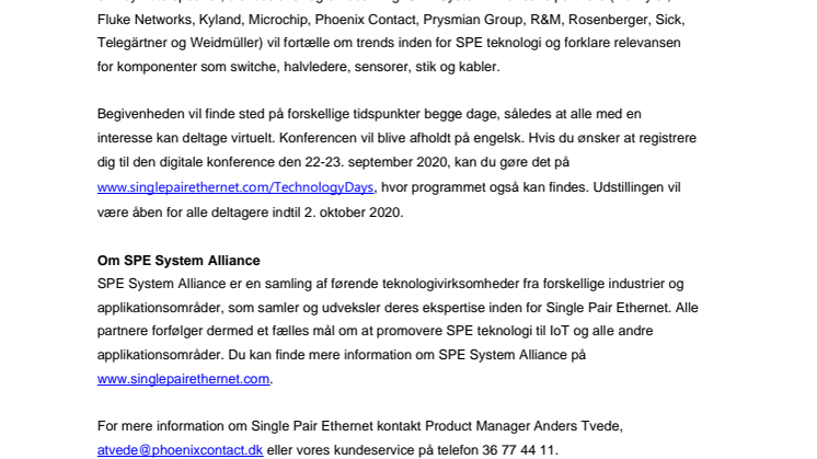 Den 22. og 23. september er SPE System Alliance værter for en international, digital udveksling af viden mellem eksperter fra forskellige industrier og teknologisektorer om emnet Single Pair Ethernet. Technology Days giver deltagerne mulighed for at tale med specialister og lære mere om den ekstra værdi, som findes i denne kommunikationsteknologi. Den digitale konference består af en key note speaker, diskussioner og en udstilling. SPE System Alliancens partnere (Dätwyler, Fluke Networks, Kyland, Microchip, Phoenix Contact, Prysmian Group, R&M, Rosenberger, Sick, Telegärtner og Weidmüller) vil fortælle om trends inden for SPE teknologi og forklare relevansen for komponenter som switche, halvledere, sensorer, stik og kabler.