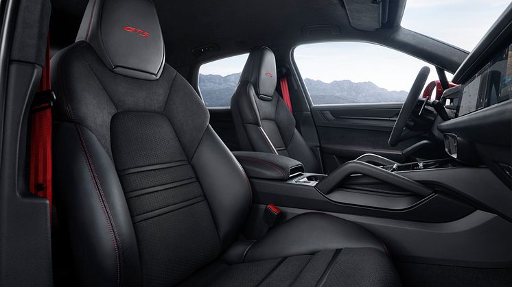 I kabinen finder du som standard et opvarmet GT-sportsrat, mens interiøret er beklædt i det ruskindslignende Race-Tex-materiale, som blandt andet dækker armlæn, dørsider og midterstykkerne i de dybe og 8-vejs-justerbare sportssæder. På Cayenne GTS Coupé er panoramatag i glas desuden standard, og endelig er der mulighed for at tilvælge to GTS-specifikke interiørpakker i Carmine Red eller Slate Grey Neo.