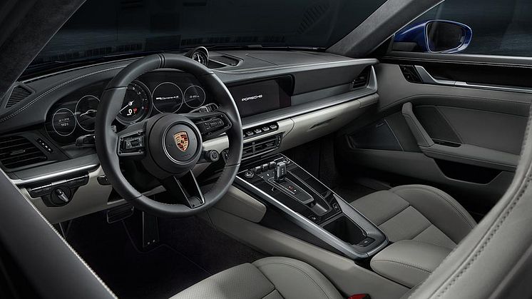 Det helt nye interiør er præget af instrumentpanelets klare og lige linjer med en tilbagetrukket instrumentenhed. Her har 911’erne fra 1970’erne været rollemodeller. Foruden omdrejningstælleren, som typiske for Porsche er placeret i midten, får føreren sine informationer via to smalle, rammeløse displays. Centerskærmen på 10,9” til Porsche Communication Management (PCM) betjenes hurtigt og nemt med den nye arkitektur. Derunder sidder en kompakt kontaktenhed med fem knapper, der giver direkte adgang til vigtige bilfunktioner. Hvad angår digitalisering, tager 911 det næste skridt ind i fremtiden med permanent opkobling samt nye funktioner og tjenester. PCM omfatter som standard blandt andet skybaseret navigation og Porsche Connect Plus.