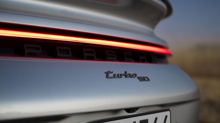 Den nye jubilæumsmodel, 911 Turbo 50 Years, hylder 50-året for ikonet med en række visuelle referencer. Det gælder for eksempel grafikken på siderne, som er inspireret af prototypen 911 RSR Turbo – en forløber for 911 Turbo, som blev vist på Frankfurt Motor Show i 1973. Jubilæumsmodellen fremstår desuden i den eksklusive farve Turbonite, som er forbeholdt nutidens Turbo-modeller fra Porsche og nu for første gang optræder på en 911.