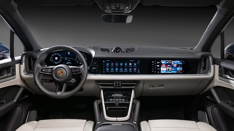 Det nye interiørdesign omfatter både instrumentpanelet, midterkonsollen samt de øverste dele af dørene. Det horisontale udtryk er ført videre fra den fuldt elektriske Taycan, hvilket får kabinen til at fremstå bredere, mens ventilationsdyserne er, karakteristisk for Cayenne fra 2011 og frem, designet vertikalt.