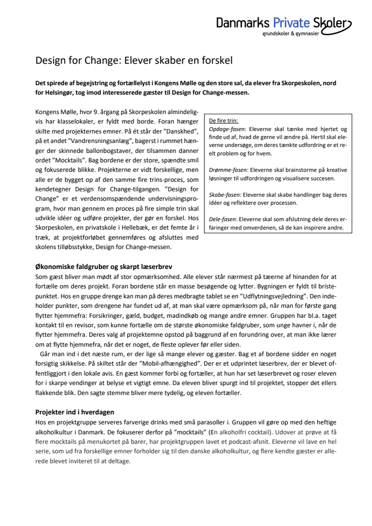 Det spirede af begejstring og fortællelyst i Kongens Mølle og den store sal, da elever fra Skorpeskolen, en privatskole nord for Helsingør, tog imod interesserede gæster til Design for Change-messen. ”Design for Change” er et verdensomspændende undervisningsprogram, hvor man gennem en proces på fire simple trin skal udvikle idéer og udføre projekter, der gør en forskel.