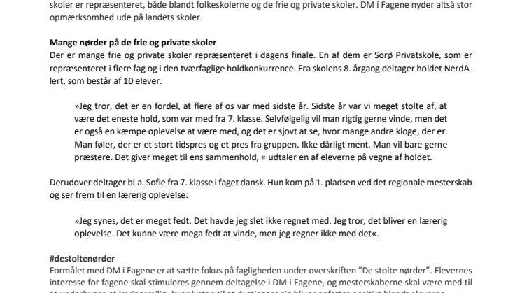 473 finalister er i dag samlet på Dokk1 i Aarhus til Landsmesterskabet i DM i Fagene. Der bliver dystet individuelt og i hold, og de frie- og private skoler er stærkt repræsenteret i alle fag. Formålet med DM i Fagene er at sætte fokus på den faglige udvikling hos eleverne under overskriften ”De stolte nørder”. Danmarks Private Skoler er del af konsortiet bag DM i Fagene og håber, at konkurrencens store deltagerantal gør, at konkurrencen har liv i mange år frem i tiden.