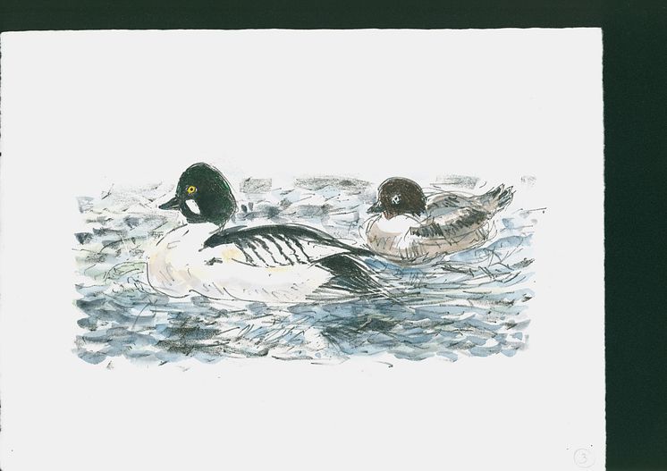 • Helge Larsen, Hvinænder, Madum Sø, stentryk og akvarel