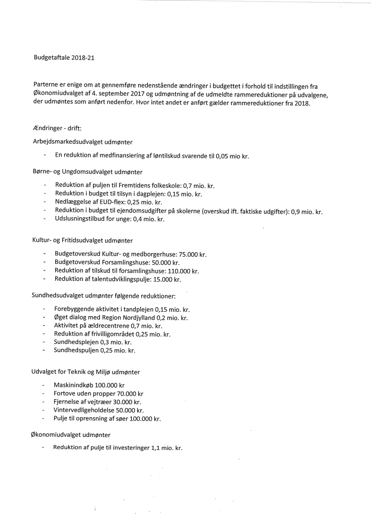 Forligspartierne er enige om, at der med budgettet for 2018 er tale om et ansvarligt budget, som både sikrer velfærdsområderne og samtidig sikrer mulighed for fortsat vækst og udvikling.