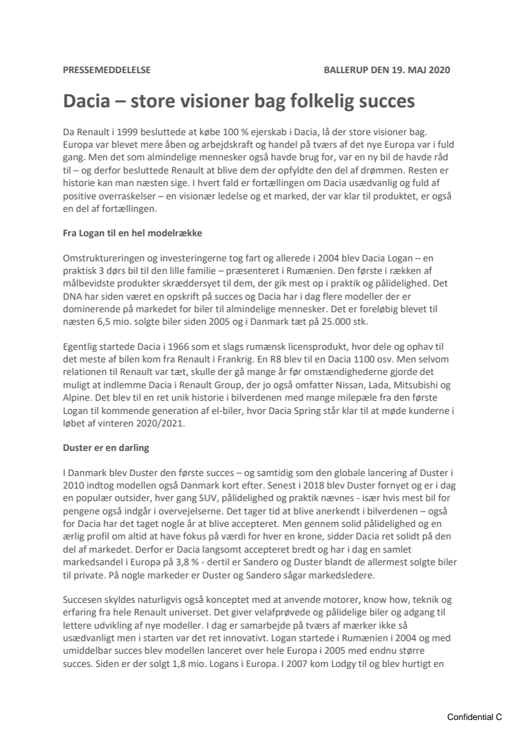Da Renault i 1999 besluttede at købe 100 % ejerskab i Dacia, lå der store visioner bag. Europa var blevet mere åben og arbejdskraft og handel på tværs af det nye Europa var i fuld gang. Men det som almindelige mennesker også havde brug for, var en ny bil de havde råd til – og derfor besluttede Renault at blive dem der opfyldte den del af drømmen. Resten er historie kan man næsten sige.