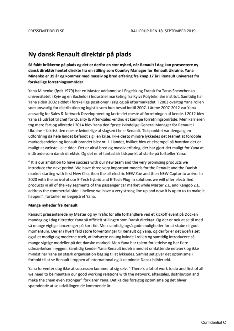 Så faldt brikkerne på plads og det er derfor en stor nyhed, når Renault i dag kan præsentere ny dansk direktør hentet direkte fra en stilling som Country Manager for Renault Ukraine. Yana Minenko er 39 år og kommer med massiv og bred erfaring fra knap 17 år i Renault universet fra forskellige forretningsområder.