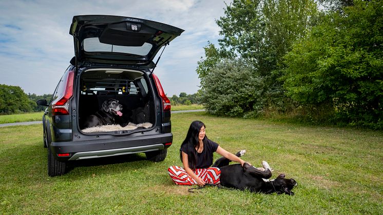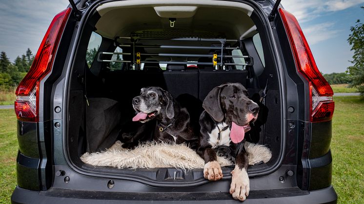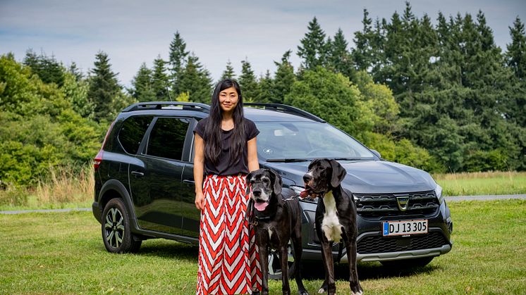 ”Jeg har to Grand Danios, Fuji og Aya som fylder pænt i landskabet. Fuji er kun 8 måneder og allerede samme størrelse som Aya på fem år, som har en mankehøjde på 84 cm. Han er fortsat i fuld vækst og ender sandsynligvis med en kampvægt på minimum 85 kilo. Så da jeg skulle have ny bil, var der mange modeller jeg allerede kunne se ikke ville fungere. Men den nye Dacia Jogger passer perfekt, og jeg glæder mig til at køre til Aarhus for at deltage i K9 Biathlon med mine hunde”, siger Camilla Christensen, der har haft Grand Danois i 19 år og er på sit 8 eksemplar.