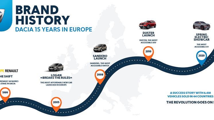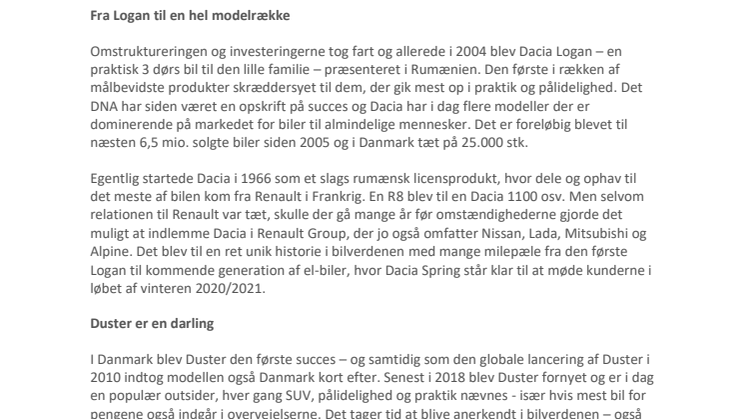 Egentlig startede Dacia i 1966 som et slags rumænsk licensprodukt, hvor dele og ophav til det meste af bilen kom fra Renault i Frankrig. En R8 blev til en Dacia 1100 osv. Men selvom relationen til Renault var tæt, skulle der gå mange år før omstændighederne gjorde det muligt at indlemme Dacia i Renault Group, der jo også omfatter Nissan, Lada, Mitsubishi og Alpine. Det blev til en ret unik historie i bilverdenen med mange milepæle fra den første Logan til kommende generation af el-biler, hvor Dacia Spring står klar til at møde kunderne i løbet af vinteren 2020/2021.