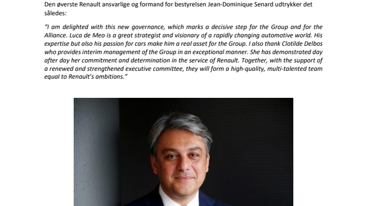 “I am delighted with this new governance, which marks a decisive step for the Group and for the Alliance. Luca de Meo is a great strategist and visionary of a rapidly changing automotive world. His expertise but also his passion for cars make him a real asset for the Group. I also thank Clotilde Delbos who provides interim management of the Group in an exceptional manner. She has demonstrated day after day her commitment and determination in the service of Renault. Together, with the support of a renewed and strengthened executive committee, they will form a high-quality, multi-talented team equal to Renault’s ambitions.”