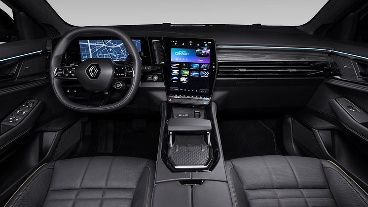 Har man set det banebrydende nye interiør i den helt nye Renault Megane E-Tech Electric, finder man sig med det samme til rette i den nye Austral. Cockpittet er bygget op omkring den store OpenR-skærm, der kombinerer 12,3" instrumentbrættets instrumentskærm med den 12" lodrette multimedieskærm. Det nye 9,3" Head Up Display, projiceret gennem forruden, tilføjer til det samlede antal skærme om bord.