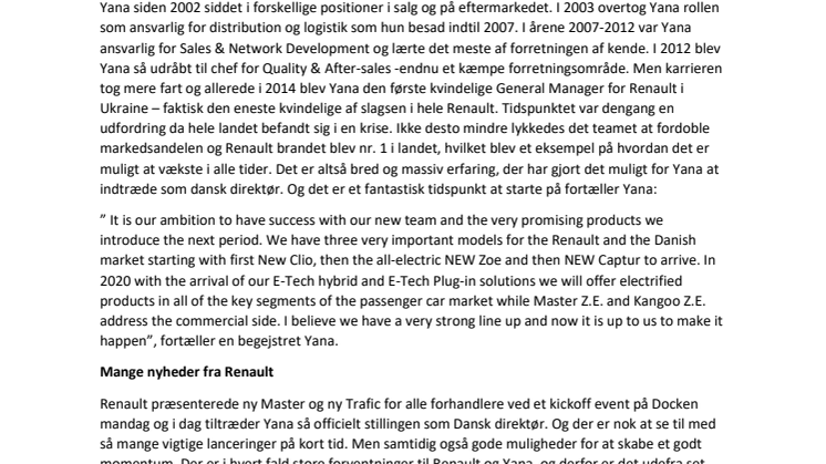 ” It is our ambition to have success with our new team and the very promising products we introduce the next period. We have three very important models for the Renault and the Danish market starting with first New Clio, then the all-electric NEW Zoe and then NEW Captur to arrive. In 2020 with the arrival of our E-Tech hybrid and E-Tech Plug-in solutions we will offer electrified products in all of the key segments of the passenger car market while Master Z.E. and Kangoo Z.E. address the commercial side. I believe we have a very strong line up and now it is up to us to make it happen”, fortæller en begejstret Yana.