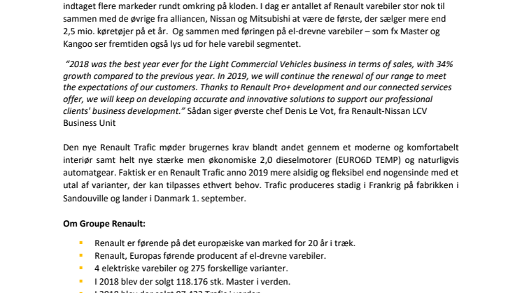 “2018 was the best year ever for the Light Commercial Vehicles business in terms of sales, with 34% growth compared to the previous year. In 2019, we will continue the renewal of our range to meet the expectations of our customers. Thanks to Renault Pro+ development and our connected services offer, we will keep on developing accurate and innovative solutions to support our professional clients' business development.” Sådan siger øverste chef Denis Le Vot, fra Renault-Nissan LCV Business Unit