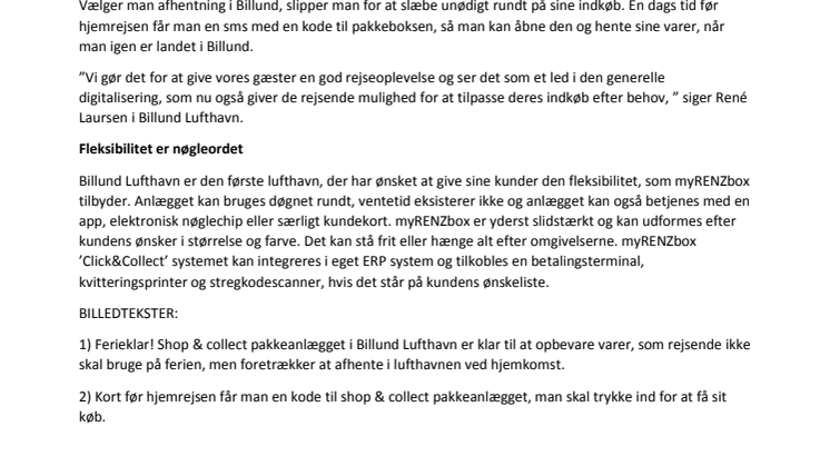 Billund Lufthavn er den første lufthavn, der har ønsket at give sine kunder den fleksibilitet, som myRENZbox tilbyder. Anlægget kan bruges døgnet rundt, ventetid eksisterer ikke og anlægget kan også betjenes med en app, elektronisk nøglechip eller særligt kundekort. MyRENZbox er yderst slidstærkt og kan udformes efter kundens ønsker i størrelse og farve. Det kan stå frit eller hænge alt efter omgivelserne. myRENZbox ’Click&Collect’ systemet kan integreres i eget ERP system og tilkobles en betalingsterminal, kvitteringsprinter og stregkodescanner, hvis det står på kundens ønskeliste.