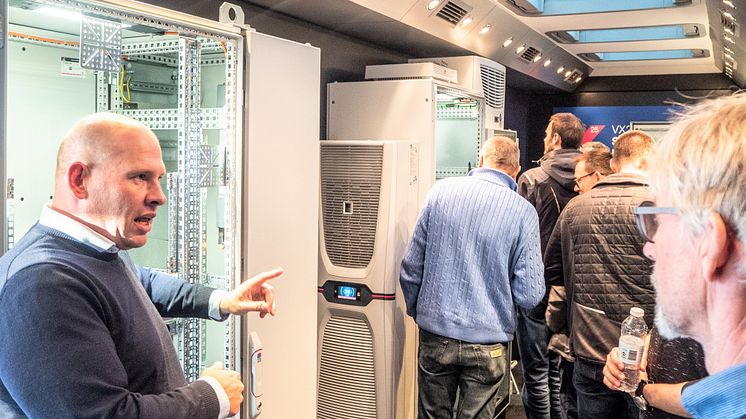 <elkas 5> Salgschef Carsten Sandby-Knudsen, Rittal A/S, viste deltagerne i seminaret Rittals nyeste produkter i demobussen.