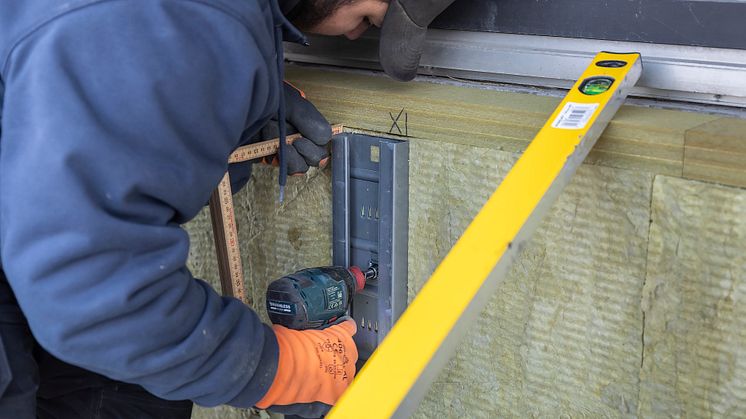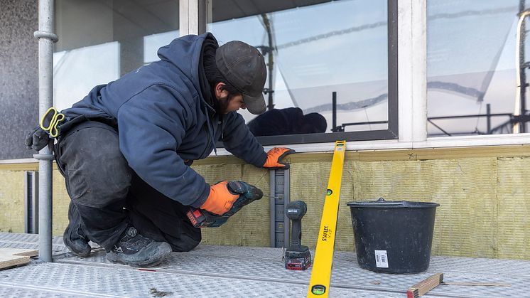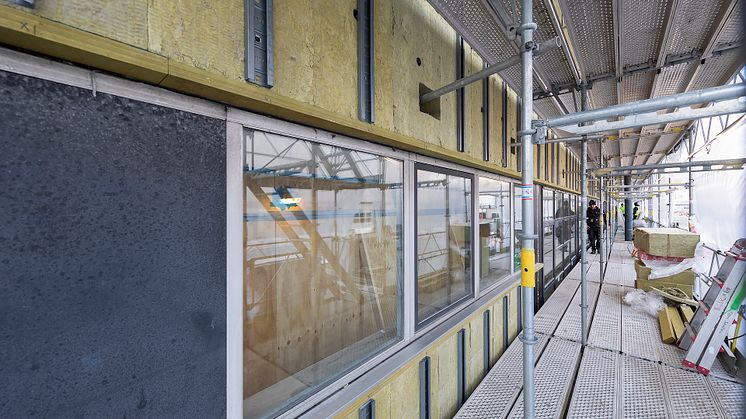 Facaden er bygget op af ROCKWOOLs REDAir Multi-løsning med 200 mm. isolering og stålprofiler til opretning. Nye vinduer monteres i REDAir LINK vindueskasser af hårdkomprimeret stenuld, der minimerer kuldebroer. På stålprofilerne monteres Steni facadeplader af natursten.