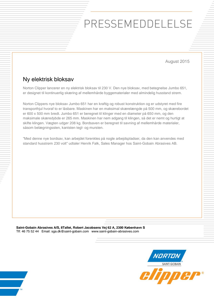 Norton Clipper lancerer en ny elektrisk bloksav til 230 V. Den nye bloksav, med betegnelse Jumbo 651, er designet til kontinuerlig skæring af mellemhårde byggematerialer med almindelig husstand strøm.