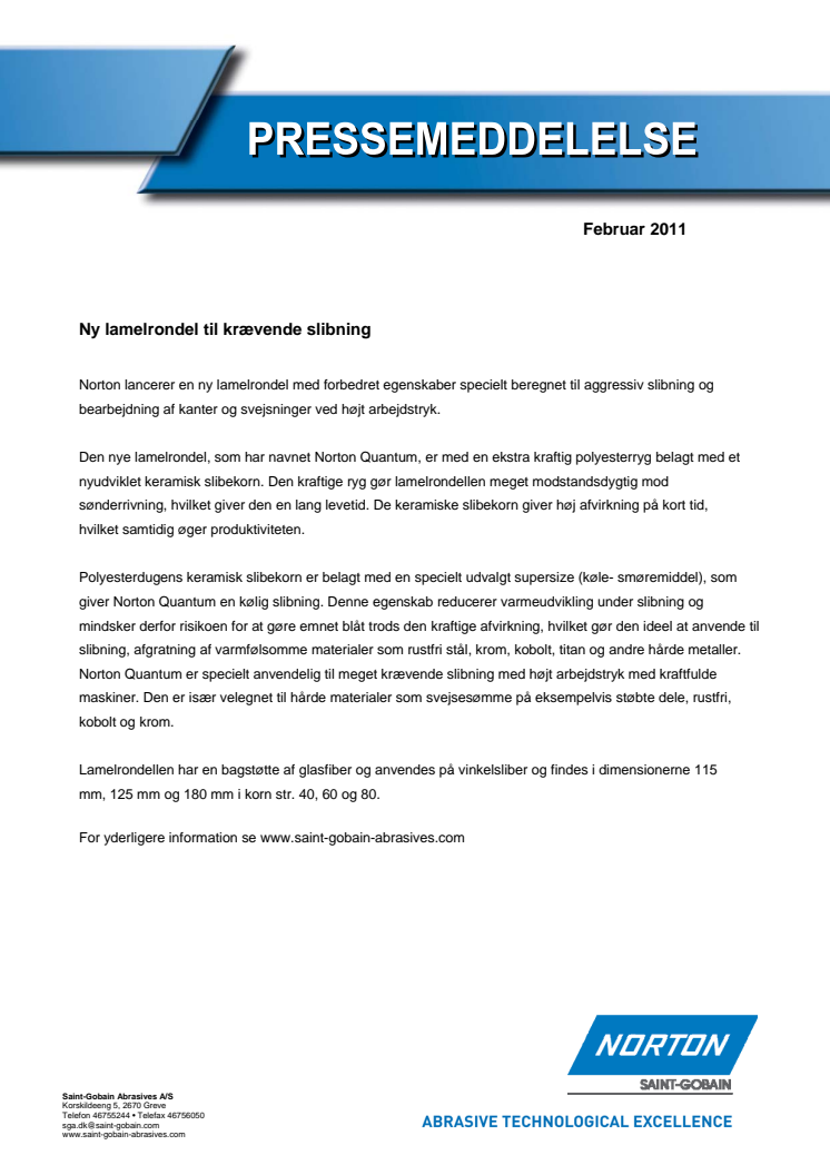 Norton lancerer en ny lamelrondel, Quantum, med forbedret egenskaber specielt beregnet til aggressiv slibning og bearbejdning af kanter og svejsninger ved højt arbejdstryk.