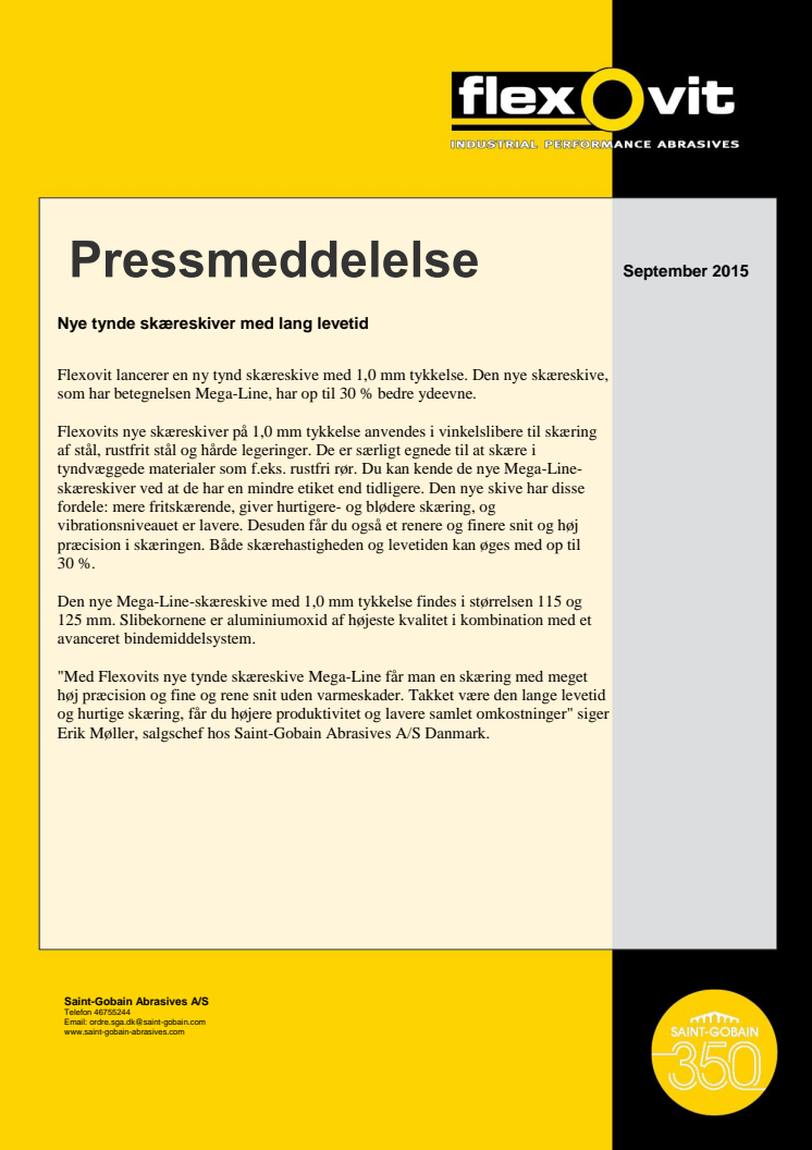 Flexovit lancerer en ny tynd skæreskive med 1,0 mm tykkelse. Den nye skæreskive, som har betegnelsen Mega-Line, har op til 30 % bedre ydeevne.
