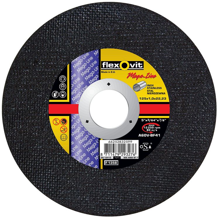 Den nye Mega-Line-skæreskive med 1,0 mm tykkelse findes i størrelsen 115 og 125 mm. Slibekornene er aluminiumoxid af højeste kvalitet i kombination med et avanceret bindemiddelsystem. Skiven er mere fritskærende, giver hurtigere- og blødere skæring, og vibrationsniveauet er lavere.