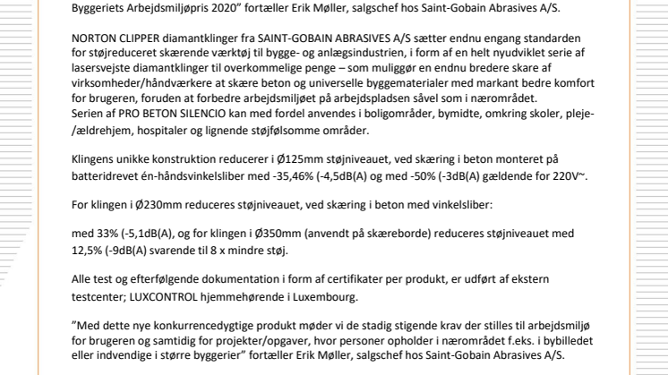 ”Med dette nye konkurrencedygtige produkt møder vi de stadig stigende krav der stilles til arbejdsmiljø for brugeren og samtidig for projekter/opgaver, hvor personer opholder i nærområdet f.eks. i bybilledet eller indvendige i større byggerier” fortæller Erik Møller, salgschef hos Saint-Gobain Abrasives A/S.