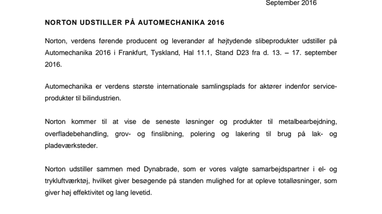 Norton, verdens førende producent og leverandør af højtydende slibeprodukter udstiller på Automechanika 2016 i Frankfurt, Tyskland, Hal 11.1, Stand D23 fra d. 13. – 17. september 2016.