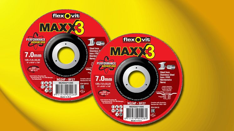 Flexovit MaXX 3 skrubskiver er beregnet til brug i vinkelslibere til slibning af stål, højlegerede chrom legeringer, rustfrit stål og andre hårde legeringer. Sortimentet omfatter skrubskiver med 7 mm tykkelse i diameter på 115, 125, 150, 180 og 230 mm. Den nye skrubskive er såkaldte ikke-jernholdige, dvs. indholdet af jern, chlor og svovl er mindre end 0,1%, hvilket eliminerer risikoen for forurening af arbejdsemnet.