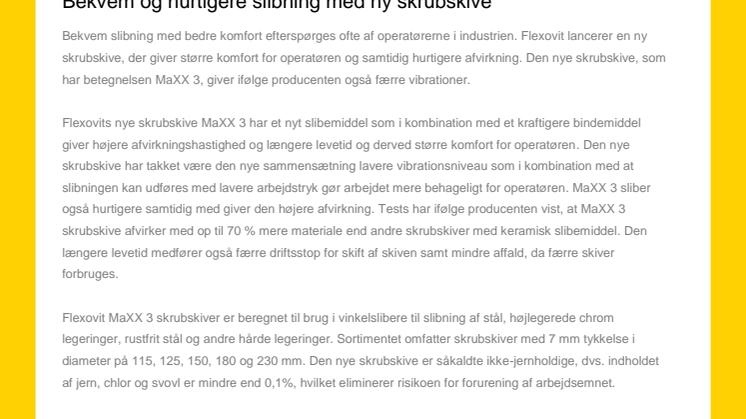 Bekvem slibning med bedre komfort efterspørges ofte af operatørerne i industrien. Flexovit lancerer en ny skrubskive, der giver større komfort for operatøren og samtidig hurtigere afvirkning. Den nye skrubskive, som har betegnelsen MaXX 3, giver ifølge producenten også færre vibrationer.