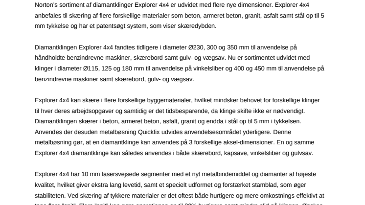 Norton’s sortiment af diamantklinger Explorer 4x4 er udvidet med flere nye dimensioner. Explorer 4x4 anbefales til skæring af flere forskellige materialer som beton, armeret beton, granit, asfalt samt stål op til5 mmtykkelse og har et patentsøgt system, som viser skæredybden.