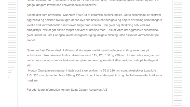 Norton lancerer en ny skrubskive Quantum Fast Cut som giver væsentligt hurtigere resultat og har 4-8 gange længere levetid end konventionelle skrubskiver.
