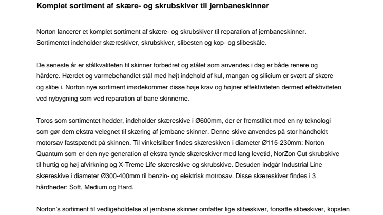 Norton lancerer et komplet sortiment af skære- og skrubskiver til reparation af jernbaneskinner. Sortimentet indeholder skæreskiver, skrubskiver, slibesten og kop- og slibeskåle.