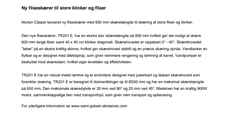 Den nye fliseskærer, TR201 E, har en ekstra stor skærelængde på 650 mm hvilket gør det muligt at skære 600 mm lange fliser samt 40 x 40 cm klinker diagonalt. Skærehovedet er vippebart 0° - 45°. Skærehovedet ”løber” på en ekstra kraftig skinne, hvilket gør skærehoved stabilt og en præcis skæring opnås. Vandtanker en flytbar og er designet med afløbsprop, som giver nemmere rengøring og tømning af karret. Vandpumper er beskyttet mod skæreslam, hvilket øger levetiden og effektiviteten.