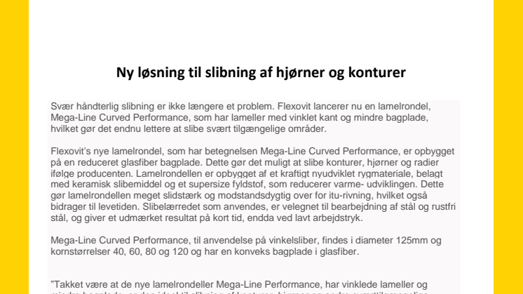 Flexovit’s nye lamelrondel, som har betegnelsen Mega-Line Curved Performance, er opbygget på en reduceret glasfiber bagplade. Dette gør det muligt at slibe konturer, hjørner og radier ifølge producenten. Lamelrondellen er opbygget af et kraftigt nyudviklet rygmateriale, belagt med keramisk slibemiddel og et supersize fyldstof, som reducerer varmeudviklingen. Dette gør lamelrondellen meget slidstærk og modstandsdygtig over for itu-rivning, hvilket også bidrager til levetiden. Slibelærredet som anvendes, er velegnet til bearbejdning af stål og rustfri stål, og giver et udmærket resultat på kort tid, endda ved lavt arbejdstryk. Mega-Line Curved Performance til anvendelse på vinkelsliber, findes i diameter 125mm og kornstørrelser 40, 60, 80 og 120 og har en konveks bagplade i glasfiber. |