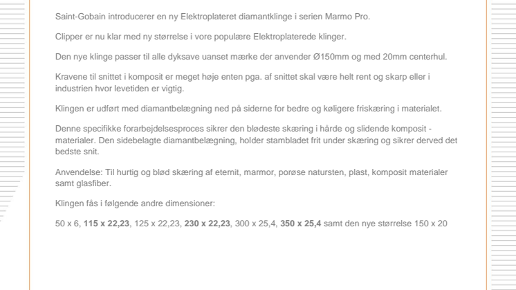 Saint-Gobain introducerer en ny Elektroplateret diamantklinge i serien Marmo Pro.
