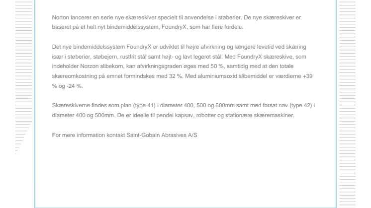 Norton lancerer en serie nye skæreskiver specielt til anvendelse i støberier. De nye skæreskiver er baseret på et helt nyt bindemiddels system, FoundryX, som har flere fordele.