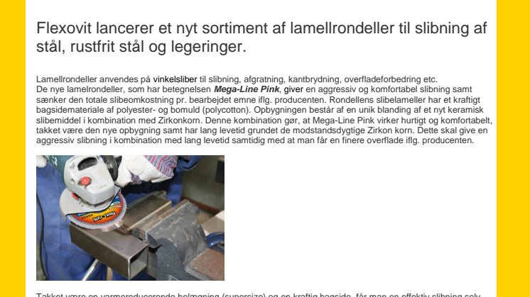 ”Med Mega-Line Pink lamelrondeller kan man opnå betydelige produktivitets-øgninger, eftersom man får en lavere total slibeomkostning. Desuden bliver arbejdet mere bekvemt for operatøren takket være det lave vibrationsniveau”, udtaler salgschef Erik Møller, Saint-Gobain Abrasives A/S