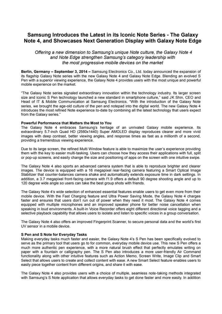 Samsung Introduces the Latest in its Iconic Note Series - The Galaxy Note 4, and Showcases Next Generation Display with Galaxy Note Edge