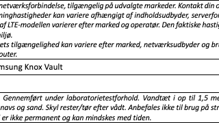 [7] Galaxy Tab S9 FE, Tab S9 FE+ og inbox S Pen er klassificeret som IP68. Baseret på laboratorietestbetingelser for nedsænkning i op til 1,5 meter ferskvand i op til 30 minutter. Anbefales ikke til brug på stranden eller i poolen. Enhedens vand- og støvbestandighed er ikke permanent og kan mindskes med tiden på grund af normal slitage.
