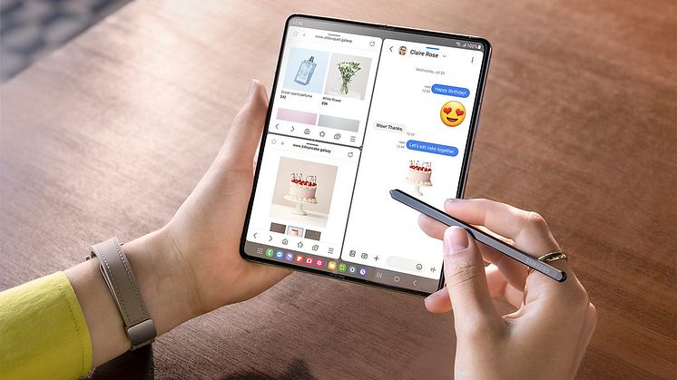 Galaxy Z Fold har været banebrydende til at transformere hverdagens produktivitet gennem en robust oplevelse på stor skærm, der har udviklet sig fra Multi Window[16] og App Continuity[17] til en bred vifte af funktioner, herunder Taskbar[18], drag and drop og optimering af tredjepartsapps. S Pen Fold Edition[19], der blev introduceret i tredje generation af Fold i 2021, er også blevet finjusteret til at levere en overlegen skriveoplevelse på Galaxy Z Fold5. Disse funktioner og værktøjer giver tilsammen en stærk produktivitet på en stor skærm og gør det muligt for brugerne at udføre vigtige opgaver hvor som helst.