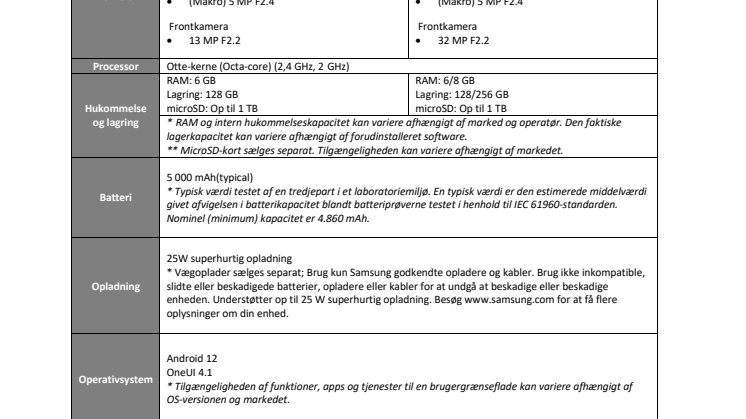 [1] Vurderet i forhold til en gennemsnitlig / typisk bruger. Uafhængig vurdering af Strategy Analytics mellem 2022.01.20-01.31 i Storbritannien med præversioner af SM-A536 og SM-A336 som standard med LTE- og 5G Sub6-netværk (IKKE testet under 5G mmWave-netværk). Den faktiske batteritid varierer afhængigt af netværksmiljøet, funktioner og apps, der bruges, opkaldsfrekvens og beskeder, antal opladningstider og mange andre faktorer.