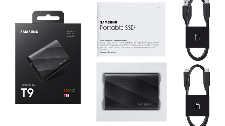 Med dokumenteret erfaring fra Portable SSD-kompatibilitet har Samsung designet T9 til at opfylde USB Type-C-strømspecifikationen og til at understøtte det problemfri workflow for professionelle content creators. Dette har forbedret kompatibiliteten på tværs af operativsystemer som Windows, macOS, smartphones og tablets, spillekonsoller og professionelle kameraer med høj opløsning. T9 leveres også med USB Type C-til-C- og USB Type C-til-A-kabler.