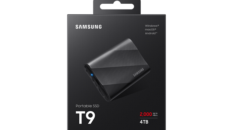 T9 tilbyder maksimal sekventiel læse-/skrivehastighed på 2.000 megabyte pr. sekund (MB/s) på USB 3.2 Gen 2x2-grænsefladen. Det er cirka to gange hurtigere end den tidligere model T7, og med hastigheder på dette niveau kan brugerne overføre en 4-gigabyte (GB) Full HD-video på næsten to sekunder.