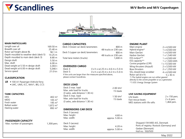 Data sheet for Scandlines hybrid ferries Berlin and Copenhagen operating the Rostock-Gedser route