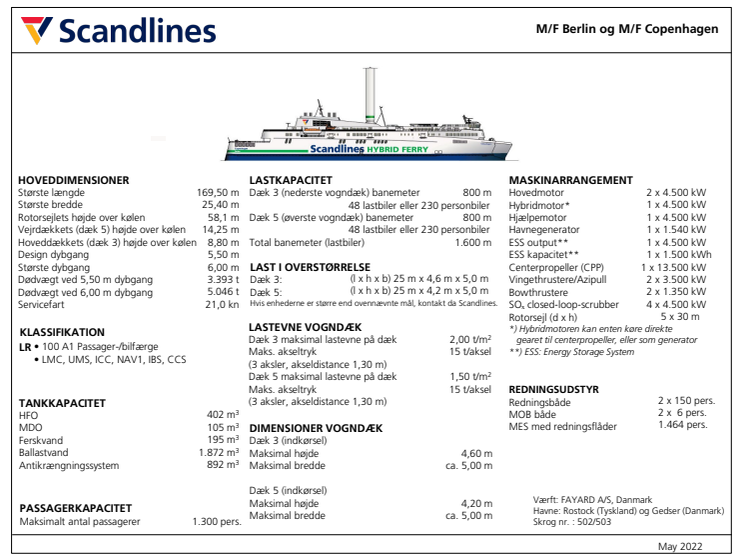 Datablad for hybridfærgerne M/F Berlin og Copenhagen