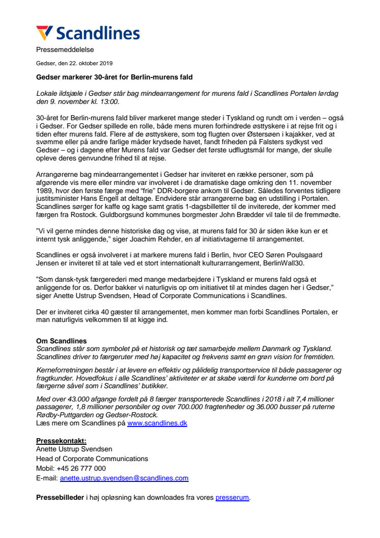 Lokale ildsjæle i Gedser står bag mindearrangement for murens fald i Scandlines Portalen lørdag den 9. november kl. 13:00.