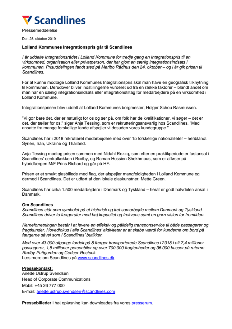 I år uddelte Integrationsrådet i Lolland Kommune for tredje gang en Integrationspris til en virksomhed, organisation eller privatperson, der har gjort en særlig integrationsindsats i kommunen. Prisuddelingen fandt sted på Maribo Rådhus den 24. oktober – og i år gik prisen til Scandlines.