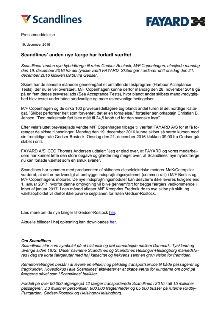 Scandlines’ anden nye hybridfærge til ruten Gedser-Rostock, M/F Copenhagen, afsejlede mandag den 19. december 2016 fra det fynske værft FAYARD. Skibet går i ordinær drift onsdag den 21. december 2016 klokken 09:00 fra Gedser.