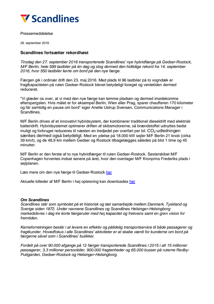 Tirsdag den 27. september 2016 transporterede Scandlines’ nye hybridfærge på Gedser-Rostock, M/F Berlin, hele 599 lastbiler på én dag og slog dermed den hidtidige rekord fra 14. september 2016, hvor 550 lastbiler kørte om bord på den nye færge.